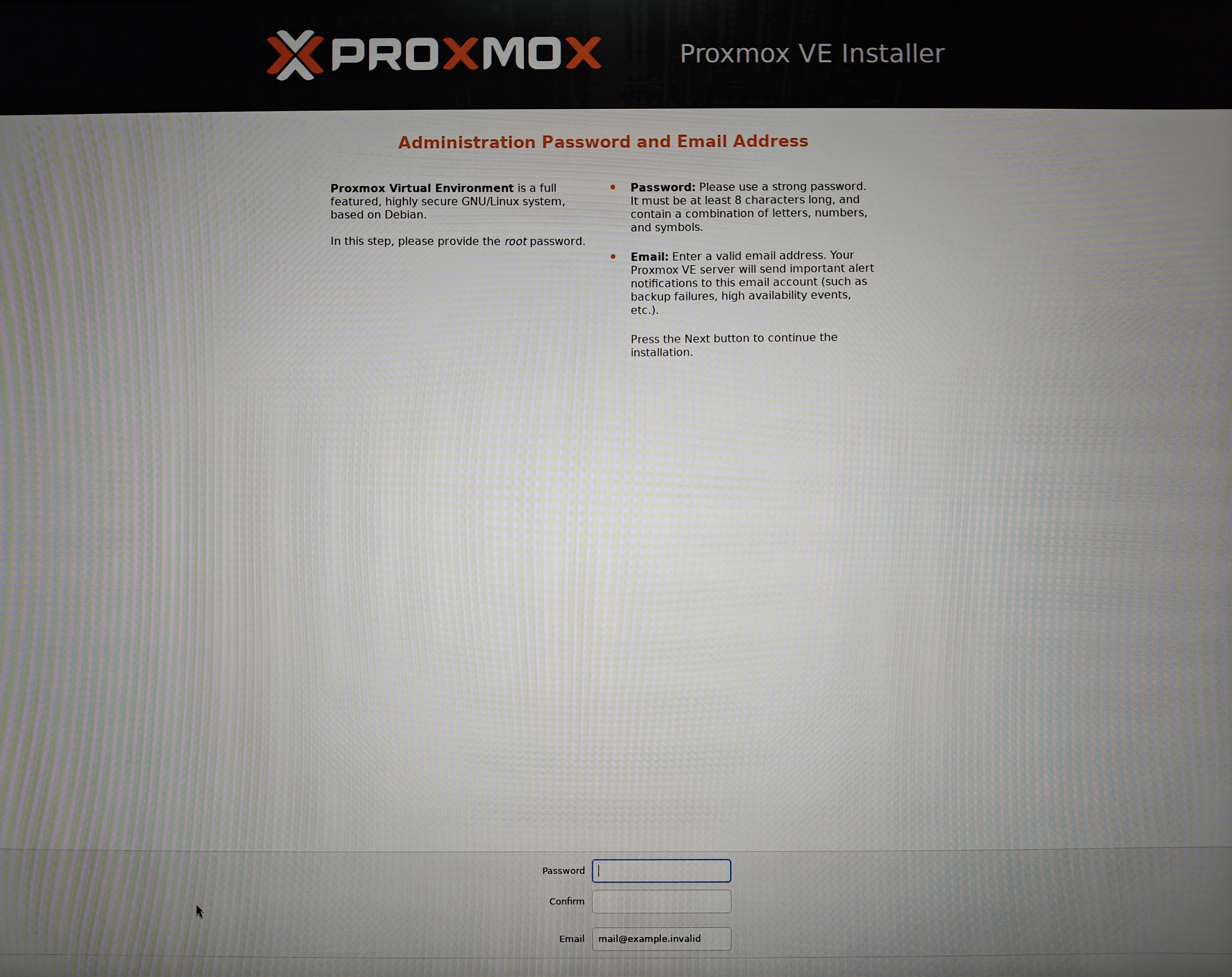 设置并确认PVE的密码,用于登录Web UI和连接SSH,填写自己的邮箱