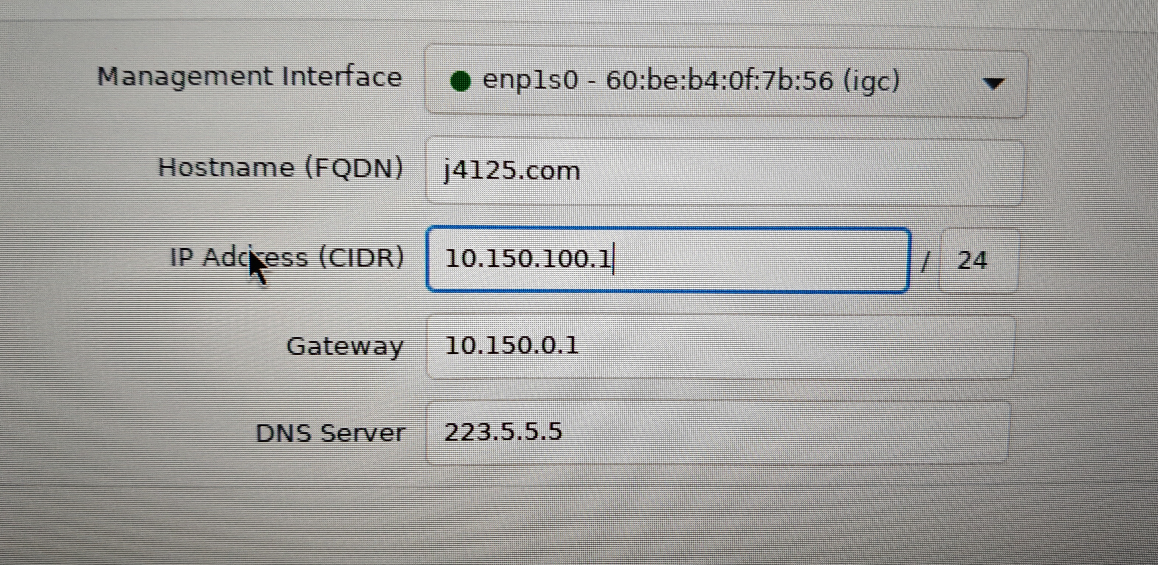 IP Address(CIDR)为小主机的管理IP地址,安装完成后,这个地址会被设置成静态地址,修改起来比较麻烦,建议提前修改为想要的 IP 地址