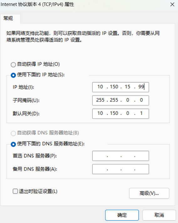 选择使用下面的IP地址,ip地址填写和管理IP同网段的任意地址,网关填写管理ip,其他和图片填写保持一致