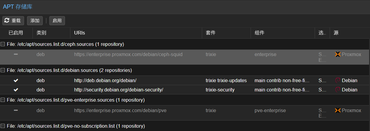 进入更新>存储库,禁用企业源/etc/apt/sources.list.d/ceph.sources和/etc/apt/sources.list.d/pve-enterprise.sources