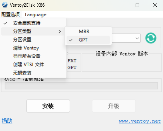 Ventoy2Disk.exe,在右上角配置选项中将分区类型改为GPT