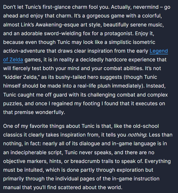 搜索ign对这个游戏的评价Tunic Review - IGN,发现最开始两段话的标点符号和图片可以对应上