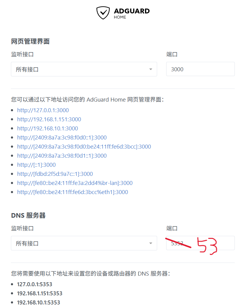 默认 53 端口由 dnsmasq 占用,上一步已将其改为 5353,释放了 53 端口。由于 DHCP 已向客户端下发 192.168.10.1 作为 DNS 服务器地址,客户端的 DNS 请求会发送至路由器 53 端口,因此由 AdGuardHome 处理
