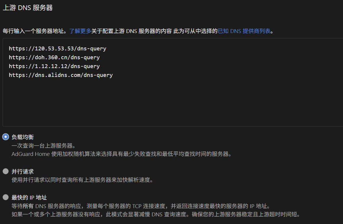 上游DNS服务器是AdGuard Home查询的服务器,设置几个最快的公共DNS服务器。这里建议使用DoH/DoT加密的DNS,不然DNS依旧会被污染和劫持