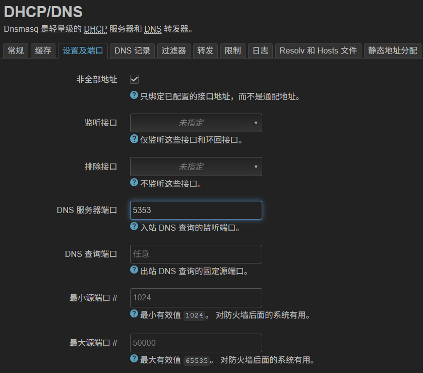 网络>DHCP/DNS>设置及端口>DNS 服务器端口设置为5353