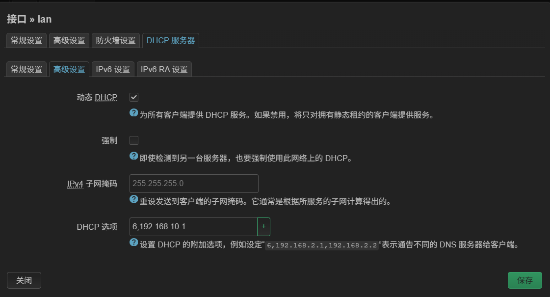 网络>接口>LAN>DHCP 服务器>高级设置>DHCP 选项设置为6,路由器LAN口地址