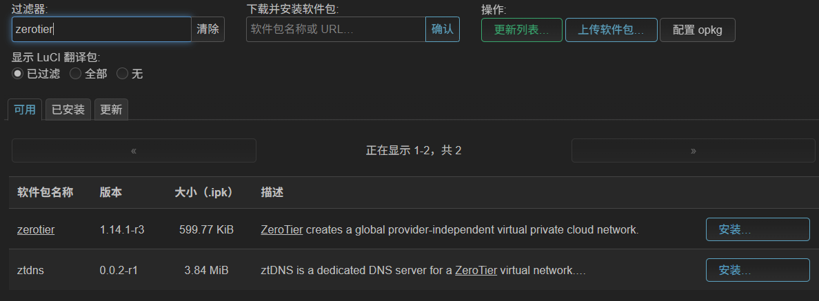 OpenWrt进入系统>软件包>上传软件包,将刚刚下载的软件包上传并安装
