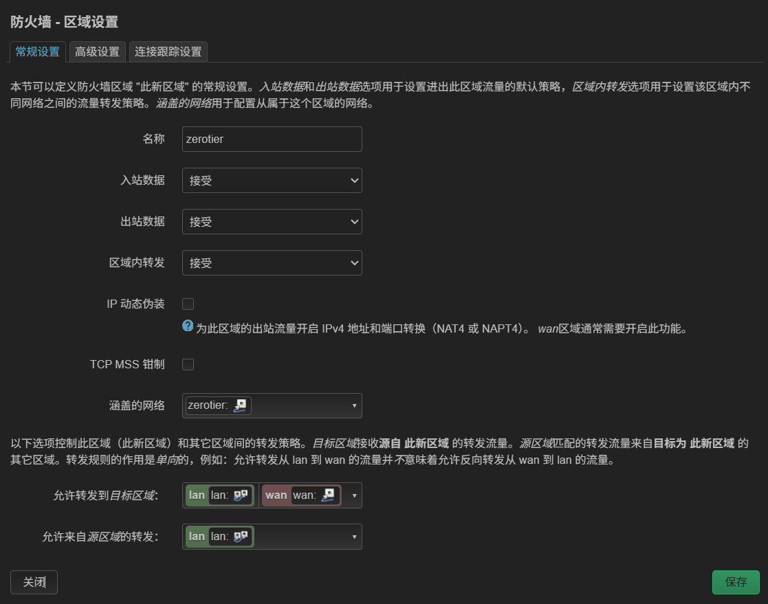 在网络>防火墙>常规设置>区域中点击添加,如图进行设置后保存