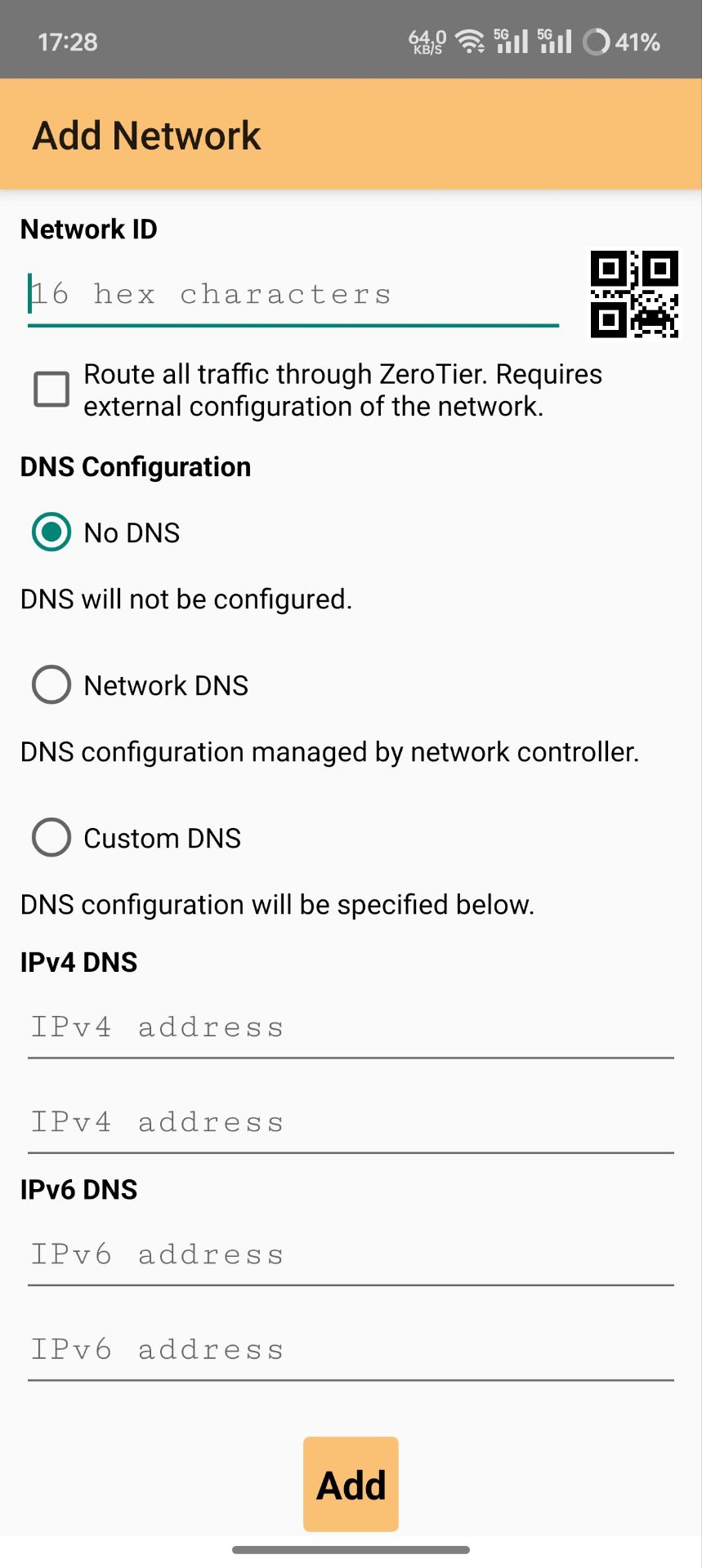 Android下载ZeroTier One应用,进入Add Network,输入Network ID加入虚拟网络