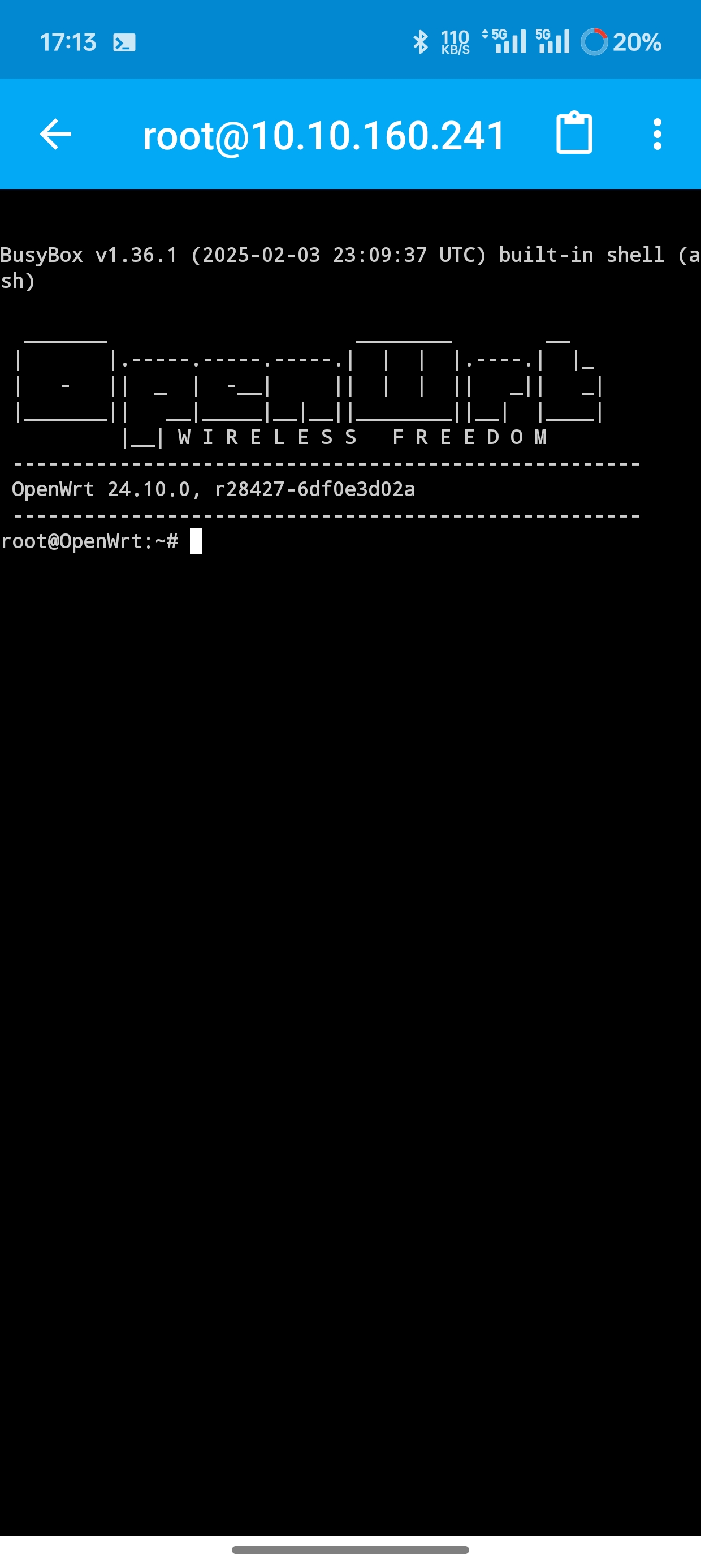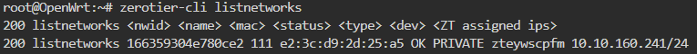 查看网络信息,可以看到当前设备加入的 ZeroTier 网络信息,意思是 OpenWrt 已经成功加入了一个名为 111 的私有 ZeroTier 网络,分配到的虚拟 IP 是 10.10.160.241,网络正常