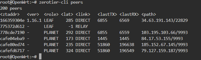 查看peers,从官网中可以知道775372d612 是我设备的ID,状态是 RELAY,延迟 -1,说明我要通信的设备目前不能直连,只能通过 ZeroTier 的中继服务器转发。ZeroTier的中继服务器在国外,这也是延迟极大的原因