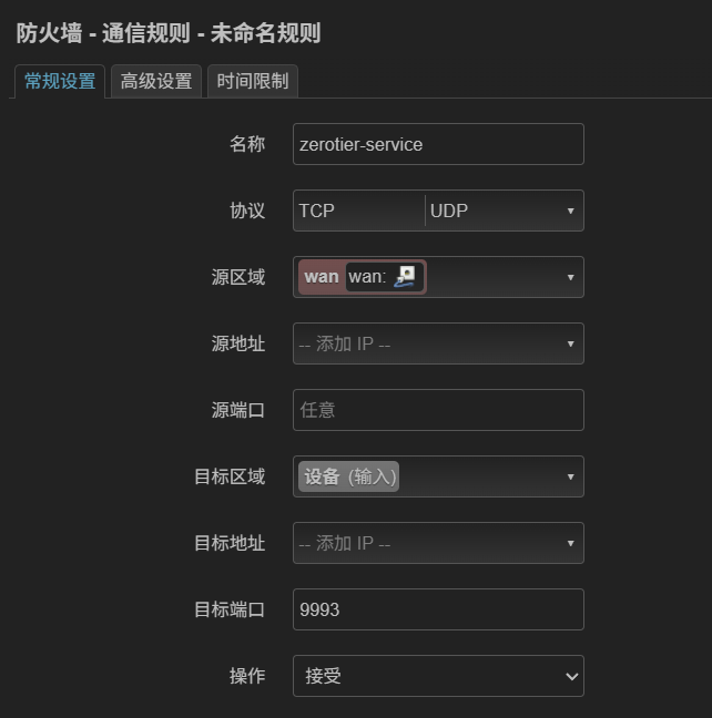 进入网络>防火墙>通信规则,添加一条新的规则,设置如图