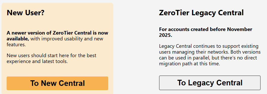 在官方文档搜索Managed Routes并跳转后,发现我访问的是https://central.zerotier.com/,有高级设置的是https://my.zerotier.com/。官方在2025年11月更新了控制面板,新平台将部分高级网络功能纳入付费套餐,现在需要花费18美元才能有这类功能。新版创建的网络不会在旧版管理界面显示,控制面板不互通,就算创建一个新的老版局域网,相信过不了多久也会没有办法使用。因此我选择放弃这个方案