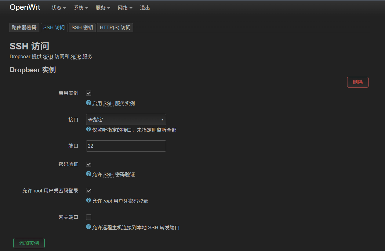 OpenWrt进入系统>管理权>SSH访问,进行如下设置