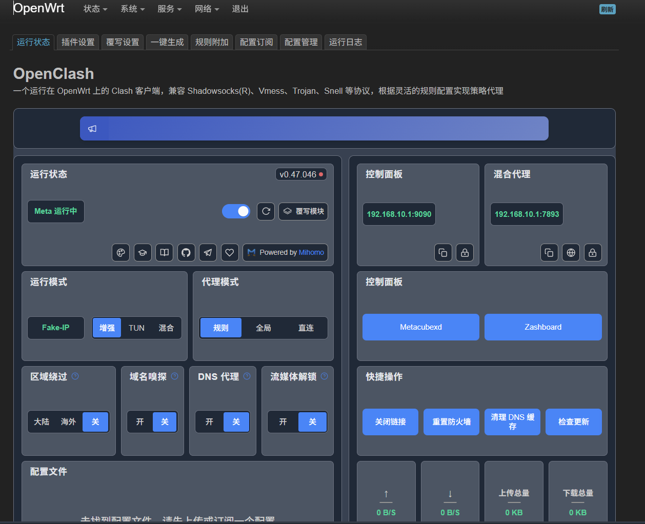 最后更新配置并启动,查看日志发现启动成功,说明配置完成,之后可以通过运行状态>控制面板来管理OpenClash