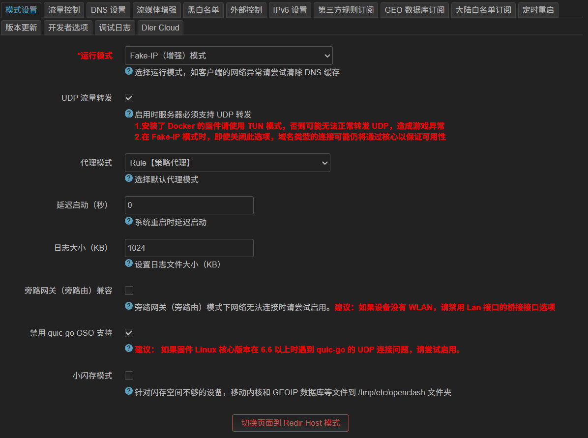 进入OpenClash>插件设置>模式设置,点击切换页面到Fake-IP模式