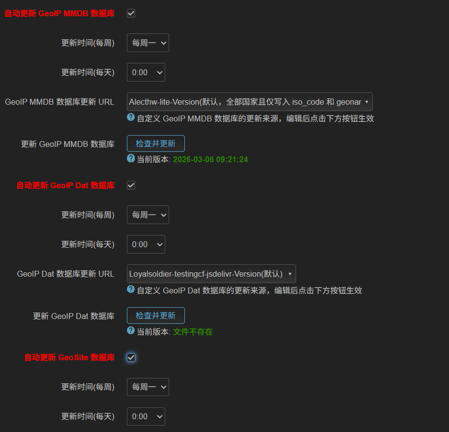 进入GEO数据库订阅,勾选自动更新 GeoIP MMDB 数据库、自动更新 GeoIP Dat 数据库、自动更新 GeoSite 数据库