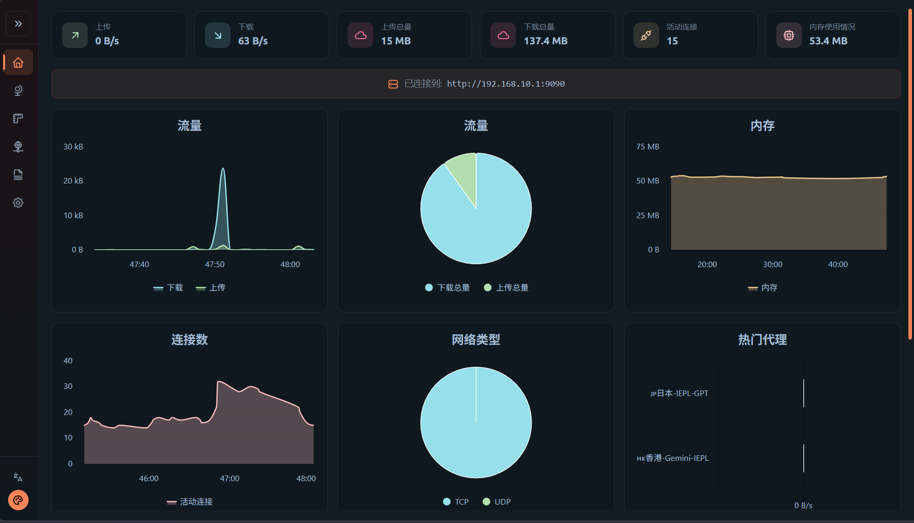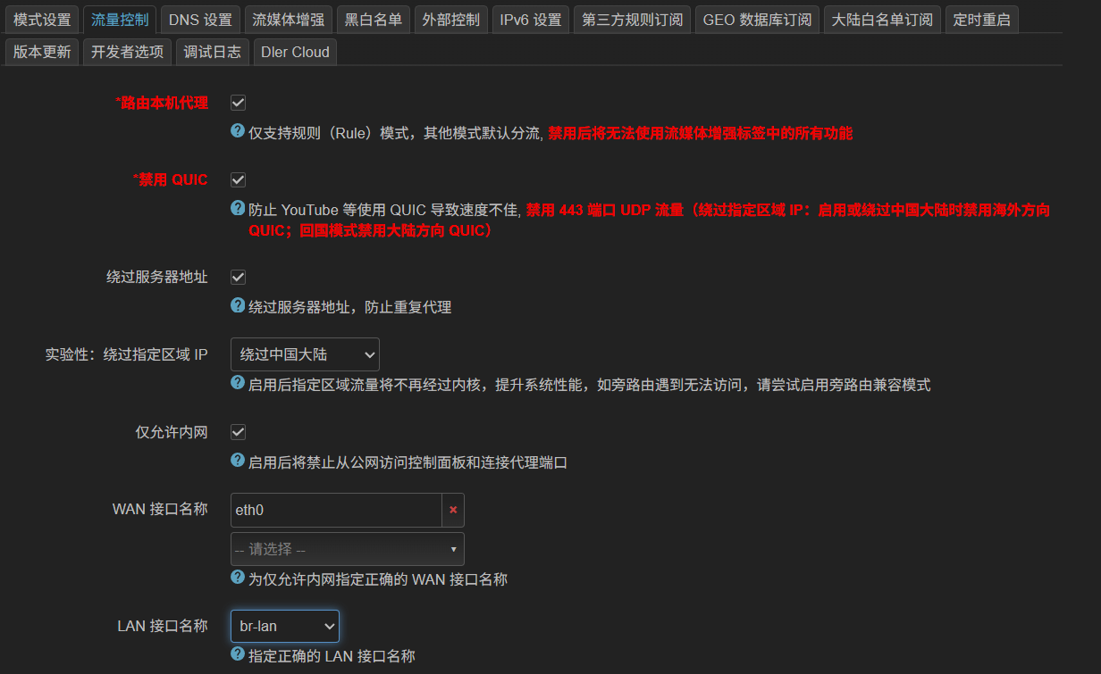 建议启用绕过中国大陆区域IP,以减少直连流量进入内核带来的性能损耗,进入流量控制进行如图设置