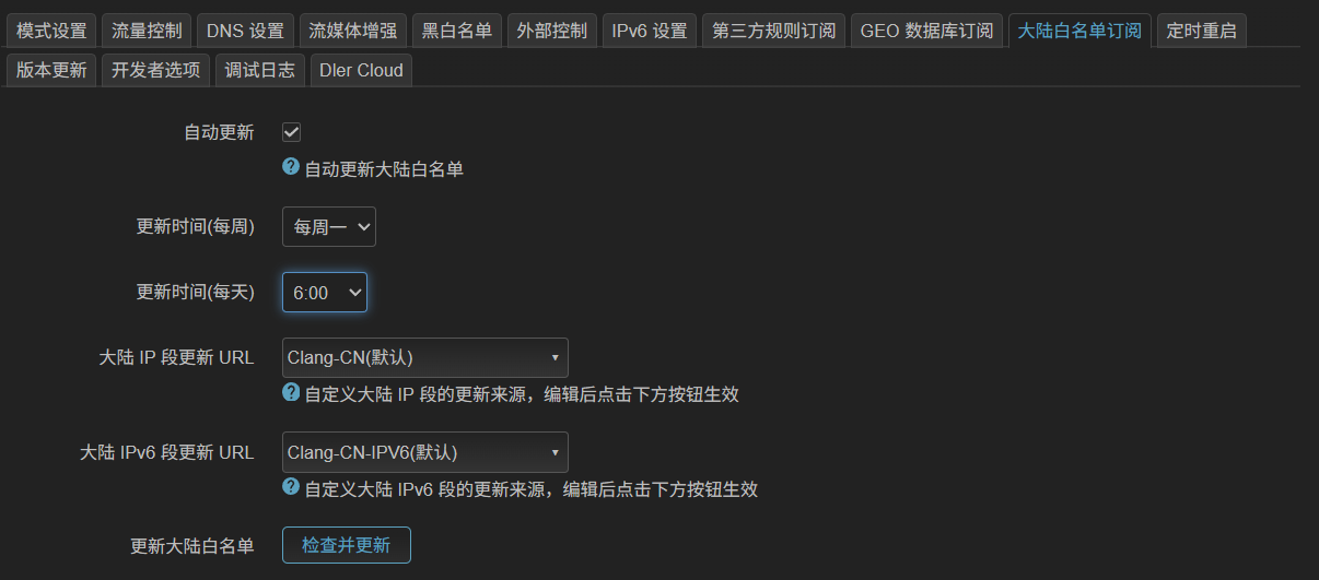 大陆白名单订阅中用于直连分流的 IP 白名单必须保持更新,按照图中设置即可