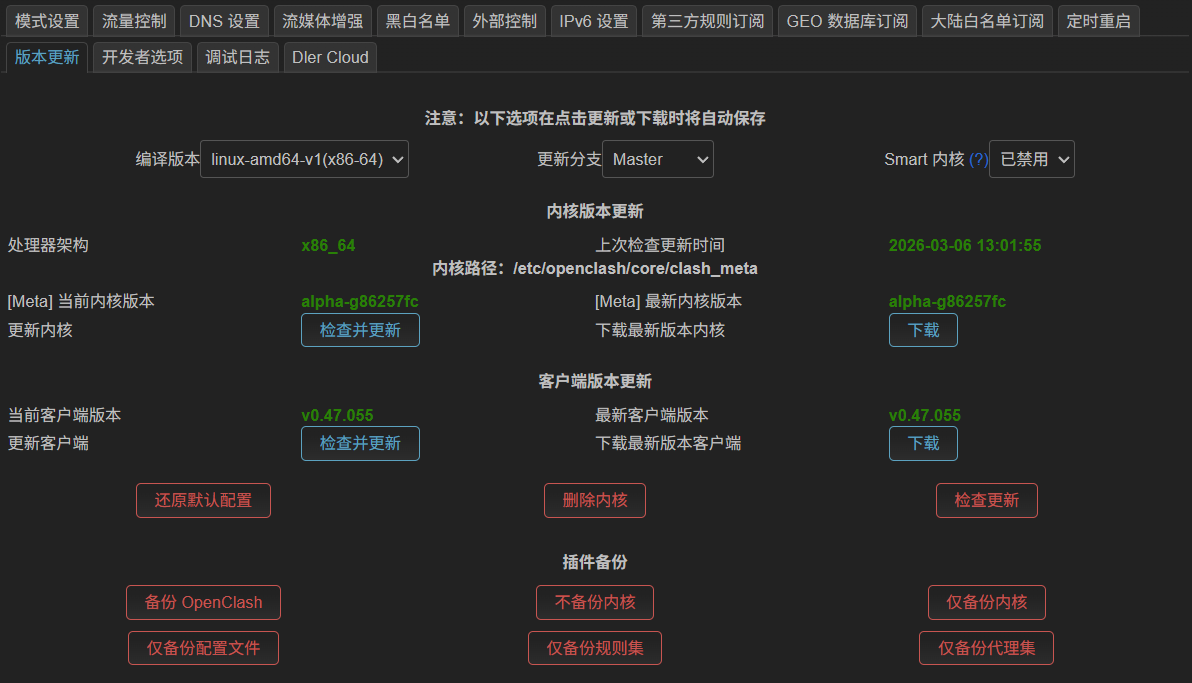版本更新建议选择 master 版本,稳定性最佳。然后点击下方的检查更新,将内核和主程序更新为最新版