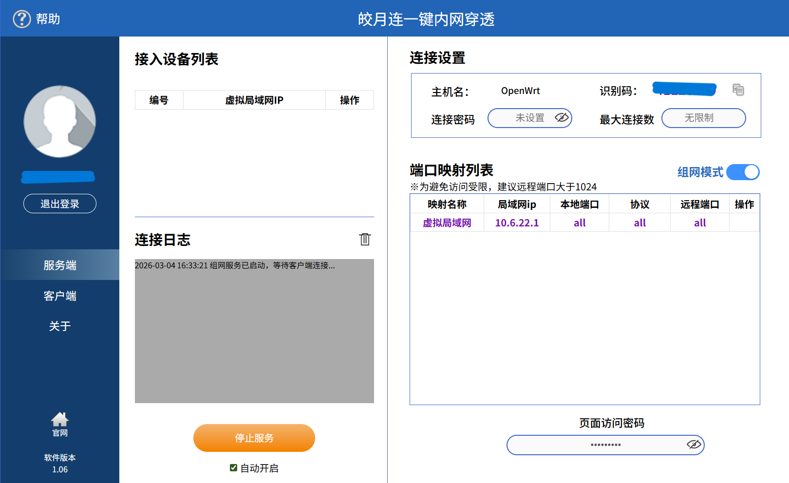 启动并访问控制界面,登录后进入服务端,开启组网模式并设置密码,这里就能看到虚拟局域网的IP,然后开启服务