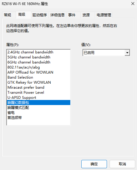 进入高级选项卡,将唤醒幻数据包和唤醒模式匹配设置为开启